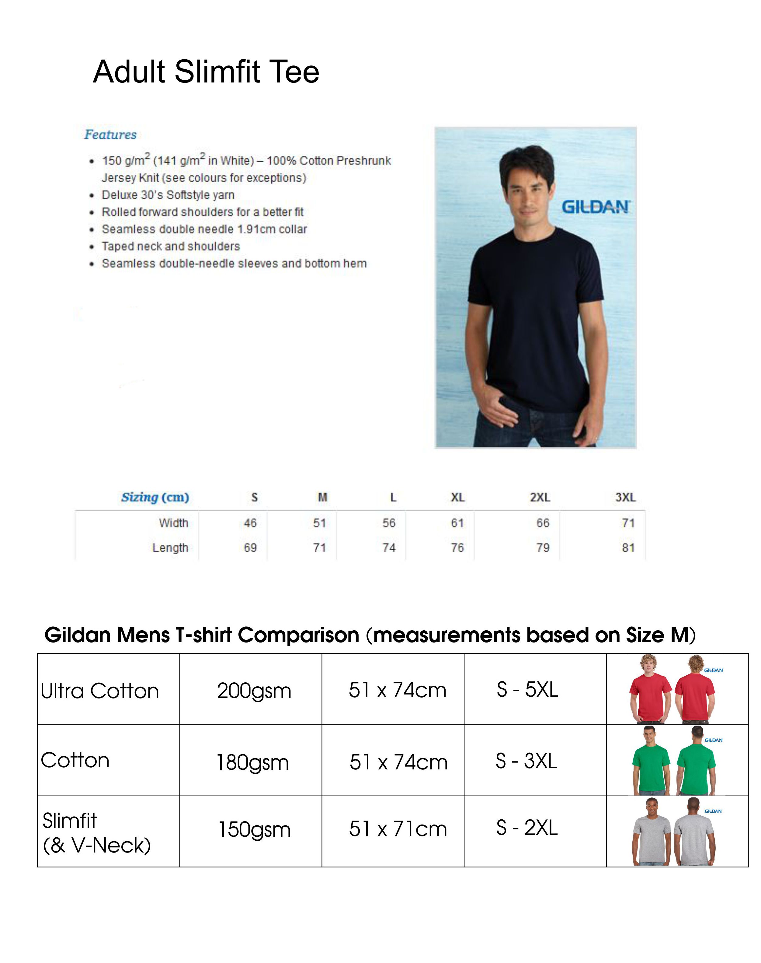 FIT: Semi-fit/Regular- please check the size chart to avoid disappointment. Lay your own tee flat on a table, measure armpit to armpit across the chest and match to the size you feel is best. Please note measurements can vary within 2.5cm, this is within the accepted tolerance.