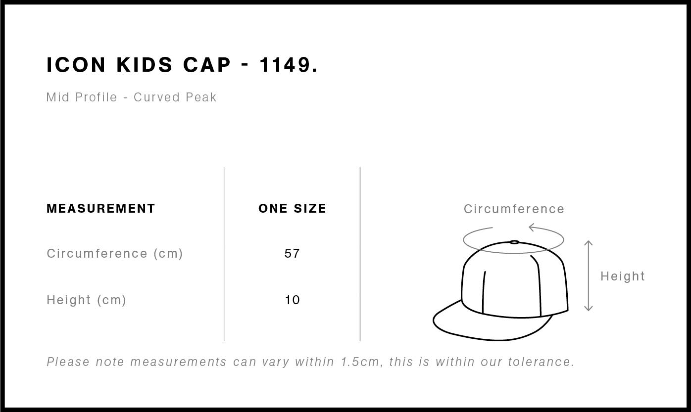 The AS Colour Kids Icon Cap is a structured 6-panel cap. One size only.