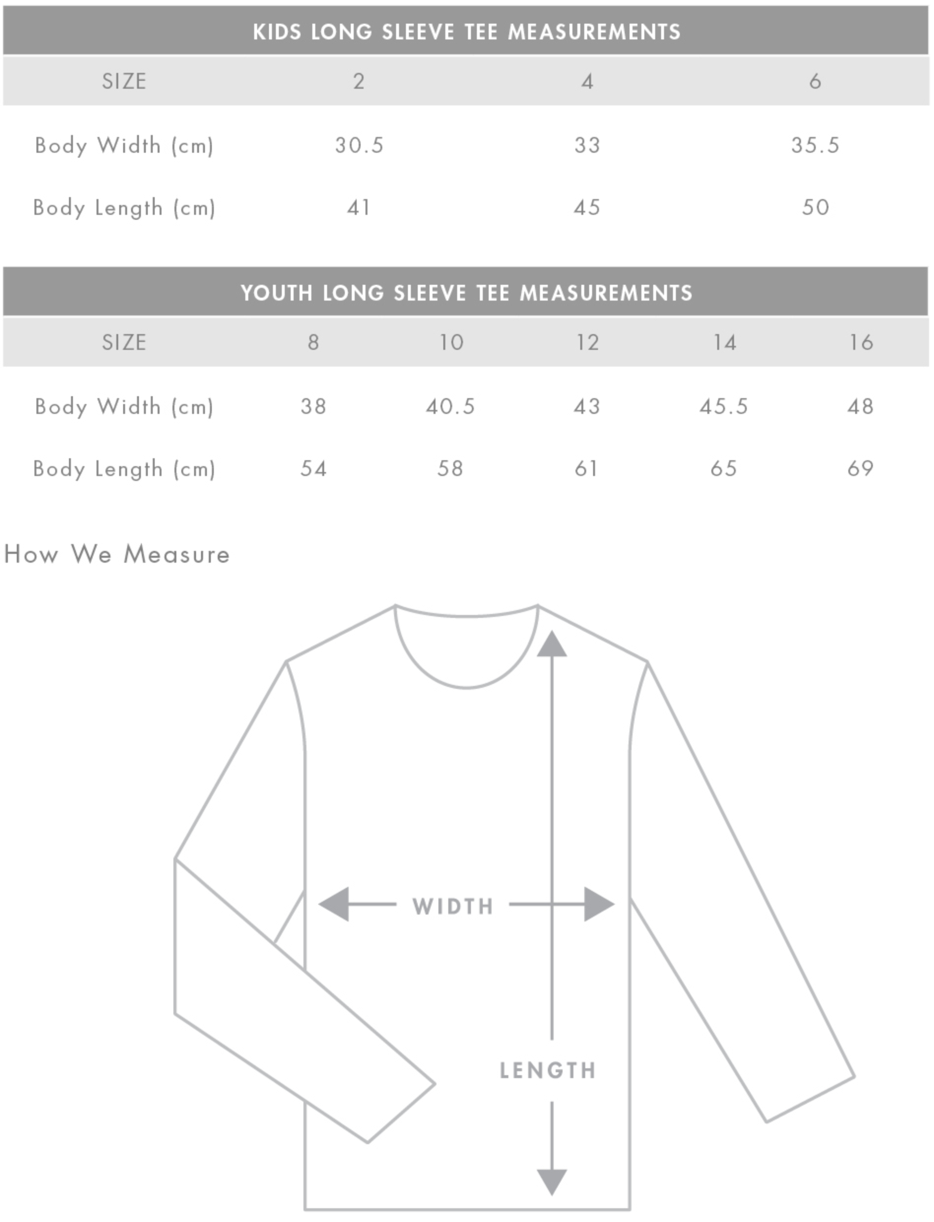 FIT: Regular fit - please check the size chart to avoid disappointment. Lay your own tee flat on a table, measure armpit to armpit across the chest and match to the size you feel is best. Please note measurements can vary within 2.5cm, this is within the accepted tolerance.