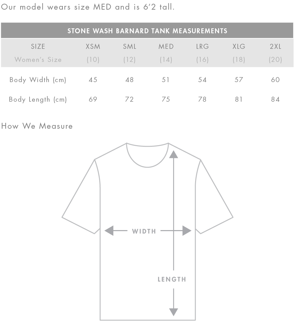 The AS Colour Stone Wash Barnard is a premium quality, mid-weight, regular fit tank with super low, raw (unsewn) arm holes. Please note that due to the manufacturing process, colour variances may occur.