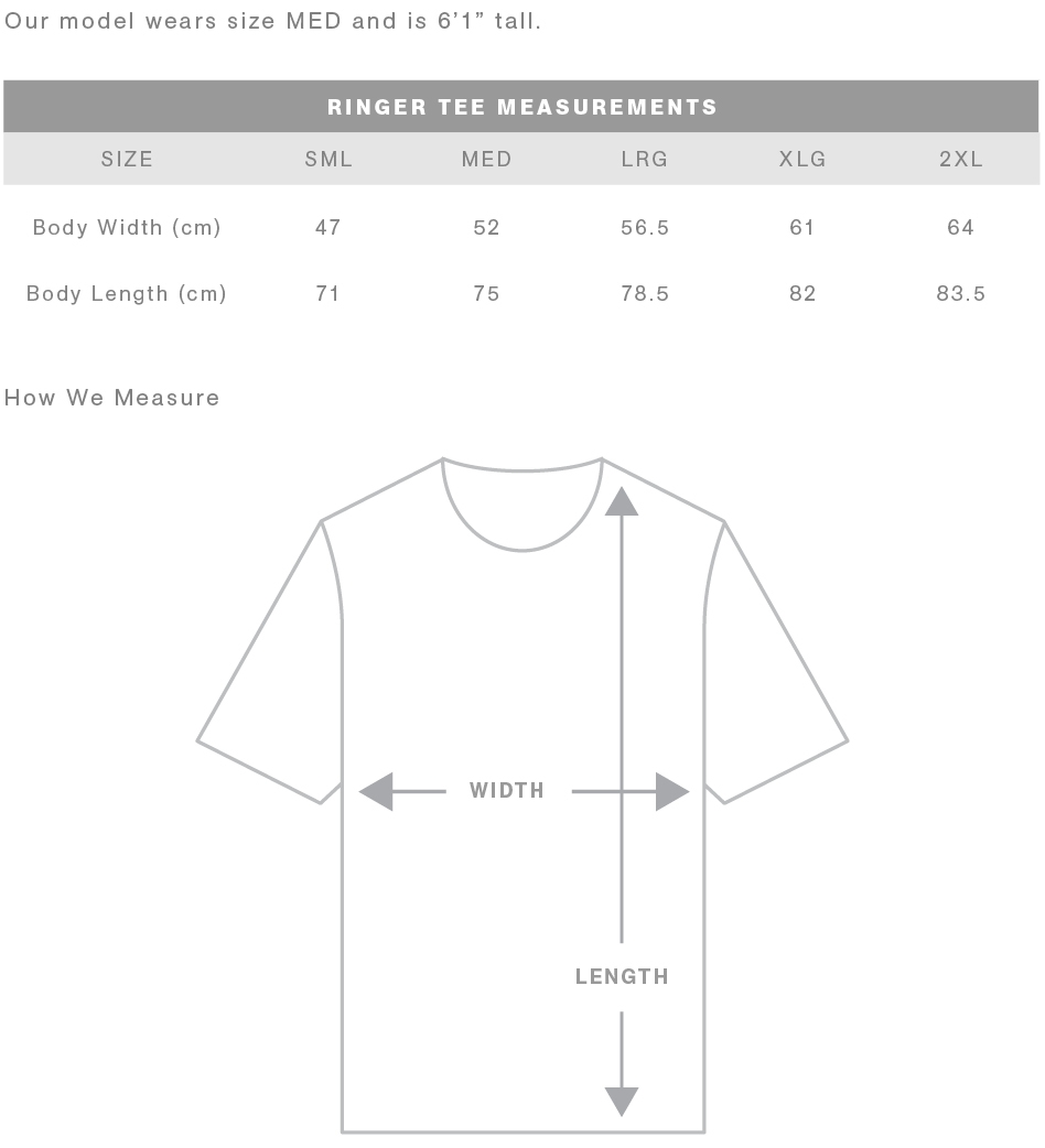 FIT: Regular fit - please check the size chart to avoid disappointment. Lay your own tee flat on a table, measure armpit to armpit across the chest and match to the size you feel is best. Please note measurements can vary within 2.5cm, this is within the accepted tolerance.