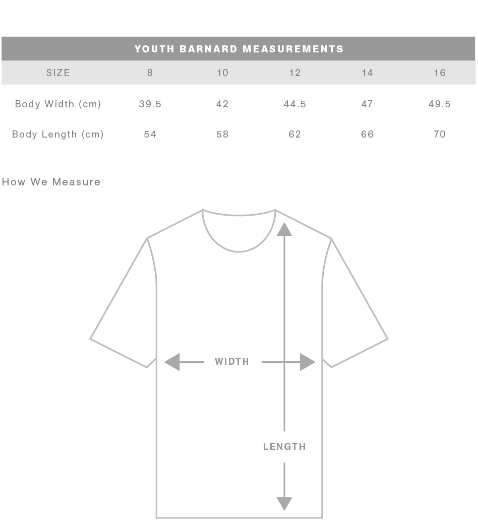 FIT: Regular fit - please check the size chart to avoid disappointment. Lay your own singlet/tee flat on a table, measure armpit to armpit across the chest and match to the size you feel is best. Please note measurements can vary within 2.5cm, this is within the accepted tolerance.
